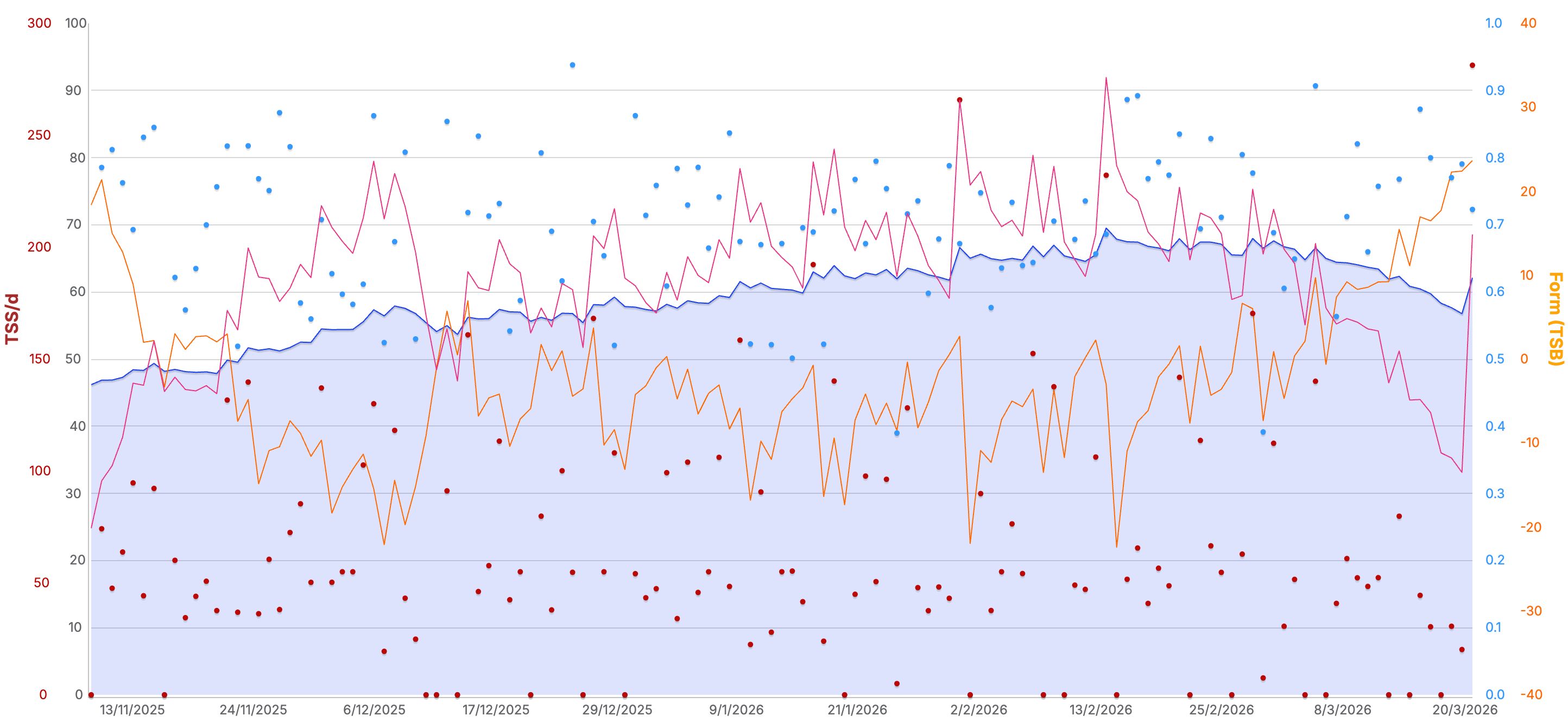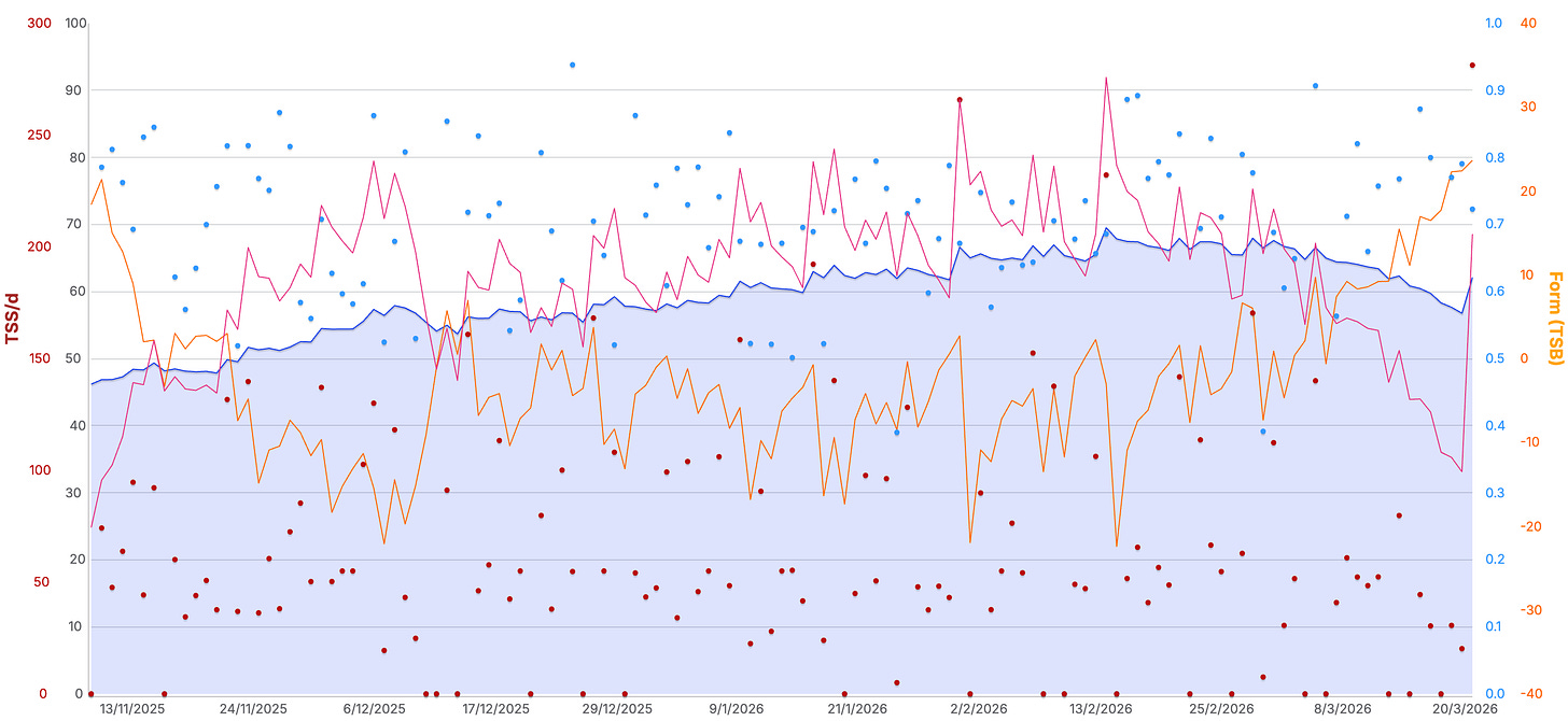 Mijn trainingsbelasting piekte rond een CTL van net onder de 70, met een zwaarste week van ruim 570 TSS. Lange duurlopen richting vier uur, met serieuze hoogtemeters, en een Pw:Hr drift die laag bleef. Het plaatje klopte.