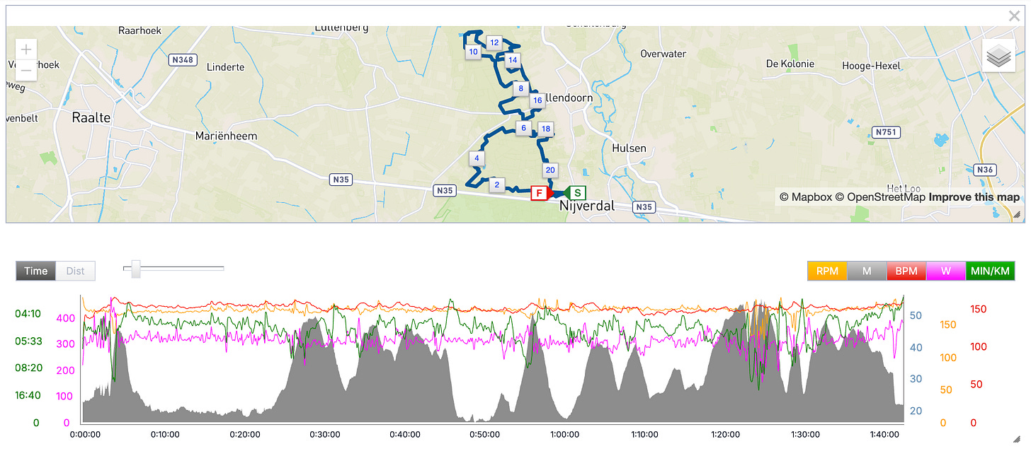 Tot een kilometer of 25–30 liep het zoals gehoopt. Mijn hartslag bleef stabiel, vermogen zat goed en conditioneel voelde het ontspannen.